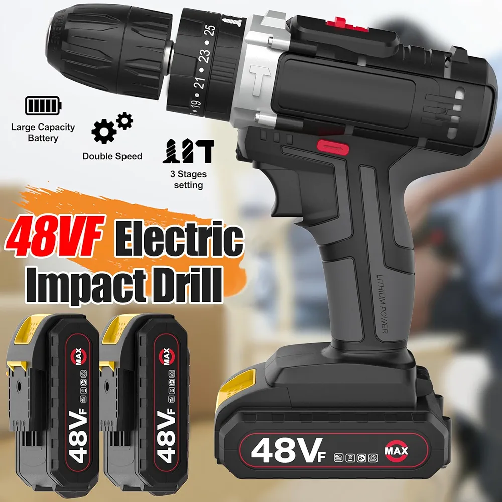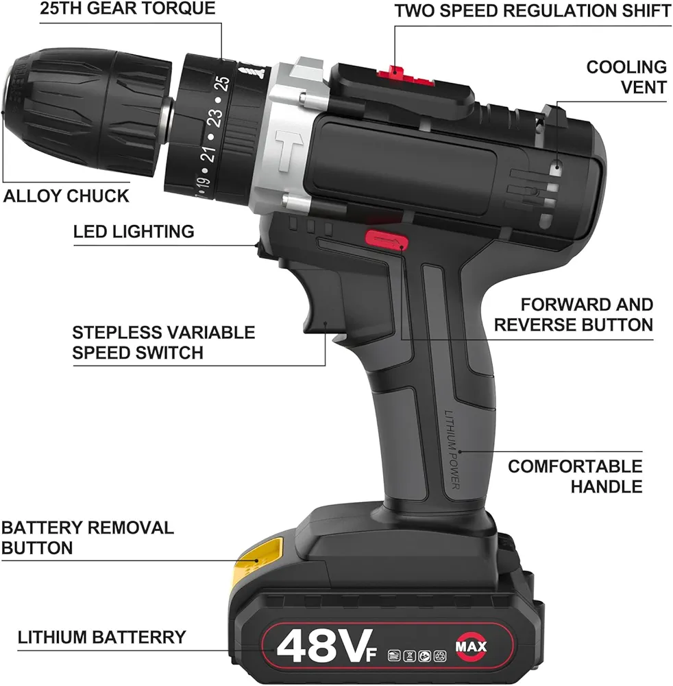 Home Electrical 48V Cordless Drill Set, Electric Drill with 2 Batteries and Charger, Electric Screwdriver Power Drill Drivers with 2 Speed, 25 Torque Setting, Built-in LED Light,Storage Case Included